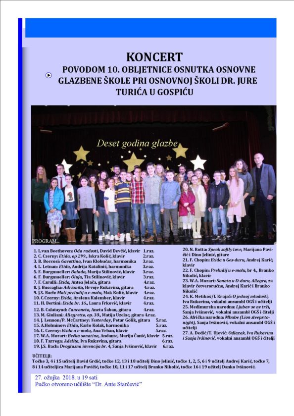 10. OBLJETNICA OSNUTKA OSNOVNE GLAZBENE ŠKOLE PRI OSNOVNOJ ŠKOLI DR. JURE TURIĆA U GOSPIĆU