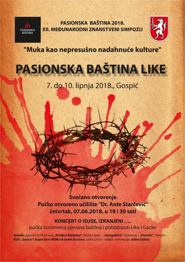 Sedmog lipnja 2018. je u dvorani POU "Dr. Ante Starčević" svečano otvoren XII MEĐUNARODNI ZNANSTVENI SIMPOZIJ na temu "Muka kao nepresušno nadahnuće kulture". Svečano otvorenje svojim su nastupom uveličali pjevači/ce KUD-ova: „Kraljica Katarina“ Donji Lapac, „Dangubice“ Kuterevo, „Perušić“ Perušić,KUU „Gacka“ i župni zbor BDM od Svete Krunice, Ličko Lešće. Odabirom i animacijom g. Joška Čalete izveli su koncert korizmene baštine i pobožnosti Like i Gacke pod nazivom O ISUSE, IZRANJENI.